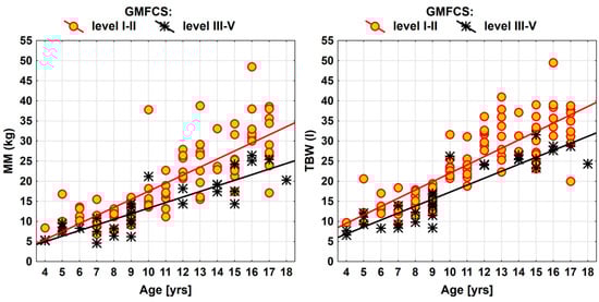 Table 5 shows relationships between motor function and measures of body composition in the children with CP. The children with higher level in GMFCS were found with significantly lower values corresponding to selected body mass components (FFM, MM, BCM, BCMI, and TBW) (p < 0.05). The effects of motor function in the body composition of children with CP are also presented (for the parameters of MM and TBW) (Figure 2).
