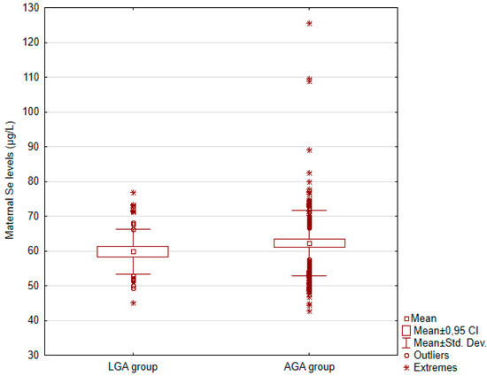 The development of these two outcomes (LGA and SGA) may depend on the coexistence of other factors, and this requires further investigation. Low levels of Se and increased oxidative stress can be a factor associated with abnormal placental development and a higher risk of SGA [15]. However, lower levels of Se in combination with other obesogenic factors may increase the risk of LGA [9].