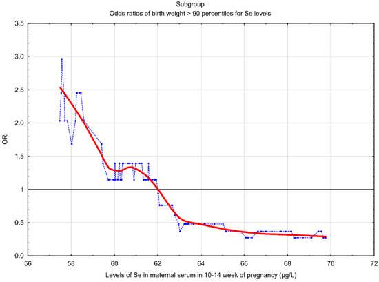The picture in Figure 2 shows that the lower maternal serum Se concentrations at the end of the first trimester were associated with a higher risk of LGA in the subgroup of women with the normal pre-pregnancy BMI. In the subgroup, the threshold point was 62.0 µg/L, below which an increase in the odds ratios of LGA was observed. In the whole group, the threshold point was 63.0 µg/L.