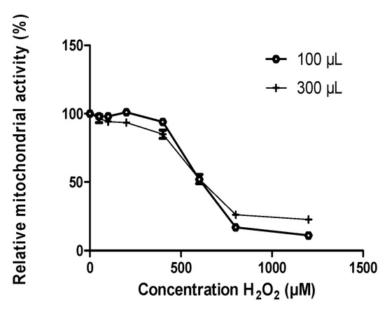 Depending on the experiment, plates had to be seeded with 100 or 300 µL of cell suspension, resulting in a different number of cells to start with. Therefore, the first step consisted of evaluating the sensitivity of cells to H2O2 in these different conditions (Figure 1). The effect of H2O2 was quantified by MTT measuring the metabolic activity and neutral red for cell survival [39]. The concentration of H2O2 leading to metabolic activity reduction of 50% was 560 ± 16 µM for 300 µL suspensions (6.104 cells) and 610 ± 20 µM for 100 µL (2.104 cells) (Boltzmann Growth/Sigmoidal function) (Figure 1). Therefore, in the following experiment we used 600 µM H2O2 to induce oxidative stress.