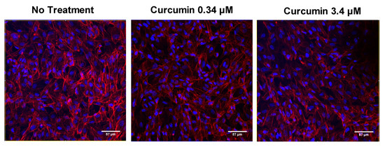 Effect of curcumin on the morphology of ARPE-19 cells. Representative images of DAPI/ Phalloidin labelling in untreated and treated cells with curcumin at 0.34 or 3.4 µM.