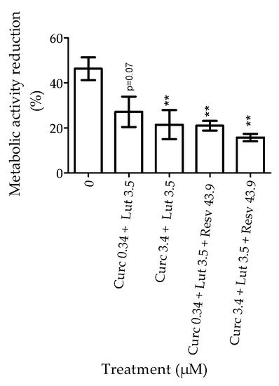 Further, the susceptibility to H2O2 was analyzed in cells pretreated with a combination of these natural agents (curcumin + lutein or curcumin + lutein + resveratrol) (Figure 4) in order to evaluate a synergistic or antagonist effect. The concentrations used were based on the previous experiments. Curcumin and lutein concentrations corresponded to the one affecting cell sensitivity to H2O2 (curcumin at 0.34 or 3.4 µM and lutein at 3.5 µM) and for resveratrol, we used the highest concentration (43.6 µM). In order to calculate the reduction of metabolic activity induced by H2O2 we subtracted the metabolic activity of cells with H2O2 to the one of cells without H2O2 for each treatment (Figure 4). The results showed that pretreatment with curcumin + lutein ± resveratrol significantly limited (p < 0.01) the reduction of metabolic activity induced by H2O2. However, there was no synergistic or antagonist effect, since the results of the combined treatment were similar to that of the single treatment (Figure 2).