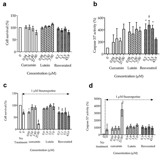 Effect of curcumin, lutein, and resveratrol on cell survival and caspase activity. (a) Cell survival and (b) caspase activity in ARPE-19 cells pre-treated for 24 h with different concentrations of curcumin, lutein, or resveratrol. (c) Cell survival and (d) caspase activity in cells pretreated for 24 hours with different concentrations of curcumin, lutein, or resveratrol and then exposed to staurosporin at 1 µM for 18 h. Results are expressed as mean % ± SEM (n = 4–5 independent experiments). Statistical significance (*) compared to no pretreatment.
