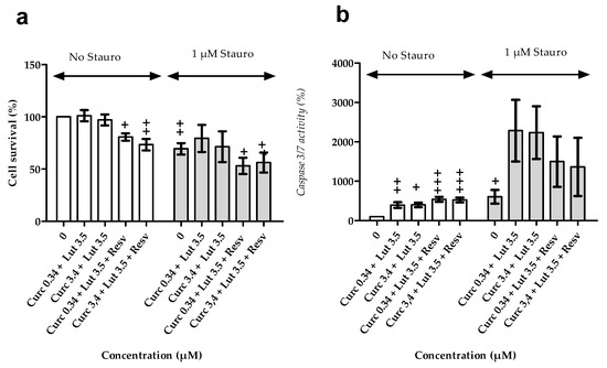 Further, the effect of a combination of natural agents (curcumin + lutein or curcumin + lutein + resveratrol) on caspase 3/7 activity and apoptosis was tested (Figure 7). Pretreatment with curcumin 0.34 µM + lutein 3.5 µM, or with curcumin 3.4 µM + lutein 3.5 µM had no effect on cell survival (Figure 7a), but it significantly increased caspase 3/7 activity by 396 ± 72 % (p = 0.006) and 400 ± 59 % (p = 0.01), respectively (Figure 7b). The addition of resveratrol reduced cell survival to 81 ± 3 % (p = 0.04) for curcumin 0.34 µM + lutein 3.5 µM + resveratrol and to 73 ± 6 % (p = 0.003) for curcumin 3.44 µM + lutein 3.5 µM + resveratrol, and increased caspase-3/7 activity to 539 ± 62 % and 525 ± 60 %, respectively (Figure 7b).