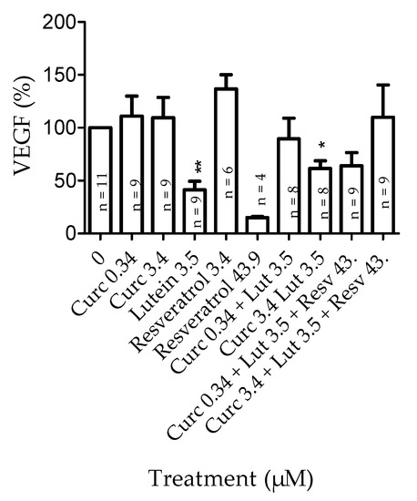 ARPE-19 cells were pretreated with curcumin, lutein, resveratrol, or a mixture of 2 or 3 of these natural agents for 24 h before collecting cell supernatants for VEGF quantification (Figure 9). When an ANOVA statistical analysis was performed, no significant difference was observed between groups. This is probably because of inter-test variations. However, when we compared the effect of each molecule individually, we observed that cell treatment with lutein significantly (p = 0.0035) reduced the basal level of VEGF secreted in culture medium, and that cell treatment with resveratrol at 3.4 µM significantly (p = 0.002) increased it. No significant effect on VEGF level was observed for cells treated with curcumin at 3.5 µM. It should be noted that the decrease in VEGF amount observed in cells treated with resveratrol at the highest concentration is related to a reduced cell number. The combination of curcumin 3.4 µM + lutein 3.5 µM significantly (p = 0.04) decreased VEGF secretion.