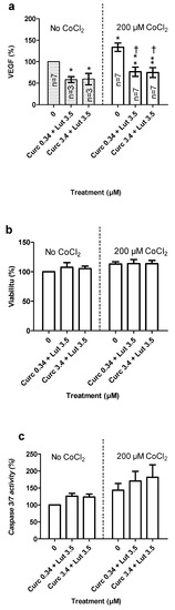 Effect of curcumin and lutein on the prevention of hypoxia-induced VEGF secretion. ARPE-19 cells were treated or untreated with curcumin + lutein for 24 h before induction of hypoxia with CoCl2 at 200 µM for 4 h. (a). VEGF quantification by ELISA in supernatants. (b). Cell viability and (c). caspase 3/7 activity (n = 4, triplicates per group). Results are expressed as mean % ± SEM. Statistical significance (*) compared to No-CoCl2-No-pretreatment or (†) compared to CoCl2-No-Pretreatment.