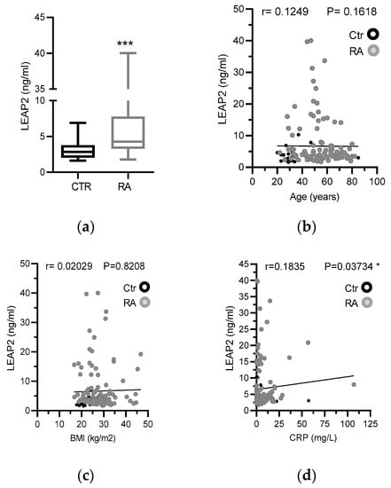 RA patients also showed a significant increase in LEAP2 serum levels compared with healthy control subjects (Figure 1a). Similar values were found for males and females; thus, gender is declined as a confounding factor (Table 1). Furthermore, a possible interference of age factor was excluded, since there is no correlation between LEAP2 levels and age (Figure 1b). Furthermore, the LEAP2 levels significantly correlated with the inflammatory marker CRP, but not with BMI (Figure 1c,d). These data suggested that LEAP2 levels are associated with an inflammatory status in RA patients, with the irrelevance of BMI.