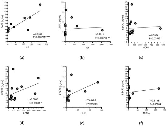Relationships between levels of serum LEAP2 and proinflammatory mediators. Plasma levels of LEAP2 protein (ng/mL), as well as pro-inflammatory cytokines, were measured in RA-treated patients as described in methods. Relationships between LEAP2 serum levels and (a) IL6, (b) IL8, (c) MCP1, (d) LCN2, (e) IL1β, and (f) MIP1α were determined. Data were analyzed by Spearman’s correlation test (r). * p < 0.05, ** p < 0.01, *** p < 0.001.