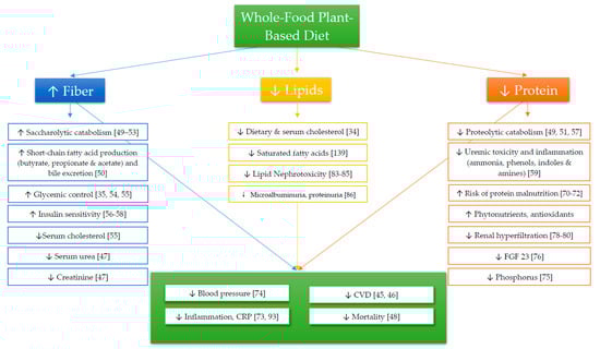 Fiber is a type of indigestible CHO that is readily available in plant foods and which enters the digestive system via the consumption of plants or plant-based products. Fiber has numerous physiological functions, many of which have been reported to provide health benefits and prevent chronic diseases [36,37,38,39,40,41]. The average American ingests 16 grams of fiber each day, far less than the recommended 28 and 34 grams—suggested by the U.S. Department of Health and Human Services (HHS) and U.S. Department of Agriculture (USDA)—for women and men, respectively [42,43]. There is well documented literature demonstrating CVD reduction with increased fiber intake, which is vital to CKD patients because the majority of CKD deaths are ultimately caused by CVD rather than ESRD [44,45,46]. In addition to conferring cardiovascular benefits, a median fiber intake of ~27 g/day reduces serum urea and creatinine levels in CKD patients, which are common markers of an abnormal glomerular filtration rate (GFR) [47]. In a study of NHANES III data conducted by Krishnamurthy et al. [48], it was found that a higher total and insoluble fiber intake attenuated the mortality rate, whereas soluble fiber had no effect on mortality. The mechanism behind the relationship of fiber with chronic disease is thought to be largely attributable to the gut microbiota, where higher fiber intake promotes fermentation and the saccharolytic (i.e., action by bacteria that primarily ferment CHO) catabolism of food, resulting in a downstream increase in beneficial short chain fatty acid (e.g., butyrate, propionate and acetate) production and bile excretion [49,50,51,52,53]. This upregulation serves to decrease serum cholesterol and glucose absorption while simultaneously increasing insulin sensitivity [54,55,56,57,58]. With increased fiber intake, the gut microbiota shifts, increasing the quantity of microflora that process and break down fiber-rich foods. This microflora also traps protein nitrogen, resulting in increased nitrogen excretion, and therefore decreased urea in the bloodstream [47]. Additionally, fiber decreases the amount of time for protein fermentation in the intestinal tract, resulting in decreased bacterial metabolites such as ammonia, phenols, indoles and amines derived from proteolytic (i.e., action by bacteria that primarily ferment protein) catabolism that contribute to uremic toxicity and cause an inflammatory state [49,51,59]. Reduced protein intake could slow the buildup of uremic toxins in the colon, mainly by replacing dietary protein with a plant-based food that contains fiber. It should be noted that fiber also plays several roles in satiety, food digestion and excretion. Fiber tends to make individuals feel fuller longer because it delays gastric emptying and promotes satiating gut hormones [57,60], which decrease the amount of food that people consume and the frequency with which they consume them. Insoluble fiber provides bulk and promotes regular movement through the gastrointestinal tract, which is beneficial in both the CKD and ESRD populations, which often experience slower colonic transit times [61]. Additionally, fiber has been shown to decrease fasting blood glucose in individuals with TIIDM, which is a major cause of CKD [3,62]. Soluble fiber works to decrease the glycemic load of CHO by slowing the digestion rate of foods, which in turn attenuates the insulin response. Vegan and/or WFPB diets tend to be significantly higher in fiber than normal diets or low protein diets, which indicates that adopting this way of eating could provide many benefits from fiber alone [51].