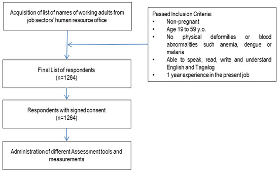 This was a one-time, cross-sectional survey in randomly selected occupational sectors, such as business process outsourcing (BPO), factory, hospitality and foods, administration, sales, and healthcare. Participants per sector were randomly selected from the list obtained from the respective Human Resource Office. Participants included in this study were aged 19 to 59 years old, able to speak, read, write, and understand English and Tagalog. They had no physical deformities, and had at least one year’s experience in the workplace. Pregnant and lactating women were excluded from the study (Figure 1).