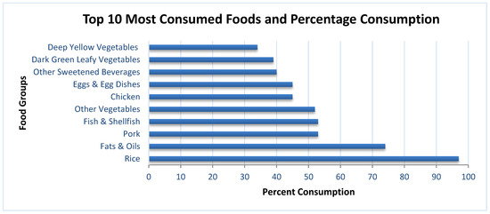 Refined rice, fats and oil, pork, fish, and other vegetables were the top five foods most consumed. The next five food items were chicken, egg and egg dishes, other sweetened beverages, dark-green leafy vegetables, and deep-yellow vegetables. The top five food sources of energy were rice, pork, fats and oils (mostly derived from plant sources), chicken, and bread. Half of the total carbohydrates came solely from refined rice, followed by bread, other sweetened beverages, noodles, and soft drinks. Refined rice, pork, fish, chicken, and egg and egg dishes were the top five contributors of protein. Forty percent (40%) of the total fat intake came from pork, while the other food sources were fats and oil (mostly plant sources), chicken, sausages, and egg (Figure 2).