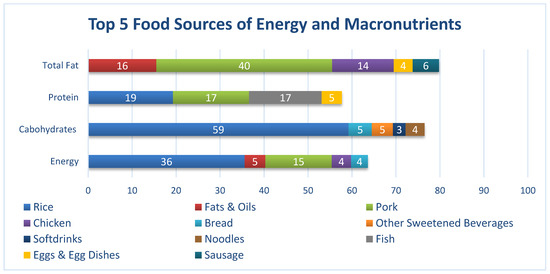 As seen in Figure 3, with regard to total energy intake, Filipino working adults consumed a significantly higher percentage of rice (36%) and pork (15%) and significantly lower percentages of fats and oils (5%), chicken (4%), as well as bread (4%). In terms of carbohydrates, rice (59%) had the highest percentage contribution, followed by bread (5%), other sweetened beverages (5%), noodles (4%), and soft drinks (3%). Contributions to the total fat intake were made mainly by the pork group (40%), followed by fats and oils (16%), chicken (14%), sausages (6%), and egg and egg dishes (4%). Lastly, with respect to protein intake, the rice group (19%) had the highest percentage contribution, preceded by pork (17%), fish (17%), and egg and egg dishes (5%).