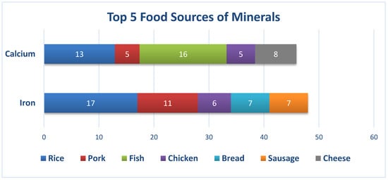 As seen in Figure 5, fish, refined rice, cheese, pork, and chicken were the top five food sources of calcium, while iron mainly came from refined rice, pork, sausage, bread, and chicken in the usual diet of Filipino working adults. Although calcium can be found in large amounts in beans and lentils, seeds, fish (e.g., salmon and sardines), and green leafy vegetables, the diets of working adults seemed to lack these food items.