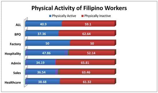 This study indicated a high prevalence of physical inactivity among Filipino workers, with 59.1% of adults being classified as inactive since they did not meet the standard guidelines of the WHO global approach to physical activity and health [41]. Marked inactivity was predominant among the Admin sector, with 65.81% of adults not meeting the recommendation for physical activity, while factory workers had a half-on-half situation, citing 50% of its workers as active and the other half as inactive. Our data confirms the rising level of physical inactivity among adults aged 20 years and over cited in the 2013 National Nutrition Survey [11]. The literature has pointed out the detrimental effects of prolonged physical inactivity on people’s health [42,43]. Evidential research has stated that prolonged inactivity increases the risk for coronary vascular accidents, type II diabetes, cancer, obesity, musculoskeletal problems, and psychological disorders, including depression and anxiety [44]. The nature of administrative work done in a seated manner forcibly engages the worker to become inactive, where office work and driving tasks are especially characterized by long periods of uninterrupted sitting. As the number of administrative and desk jobs increase, the risk of an increasing prevalence of NCDs is imminent [45]. Research still continues to support the public health need of a culture suitable for regular physical activity.