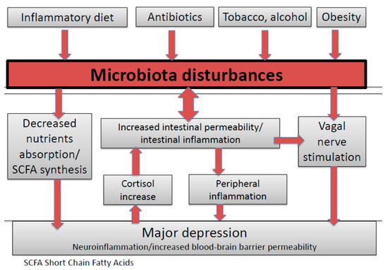 Irritable bowel syndrome is considered as a paradigmatic microbiota-induced illness. We have published a meta-analysis suggesting that patients with irritable bowel syndrome were at higher risk of major depression [37], confirming the potential causal or bilateral relationship between microbiota disturbances and major depression. Several studies have shown microbiota disturbances in patients with major depression; these disturbances are summarized in Table 1 [38,39,40,41,42,43,44,45,46,47,48,49,50].