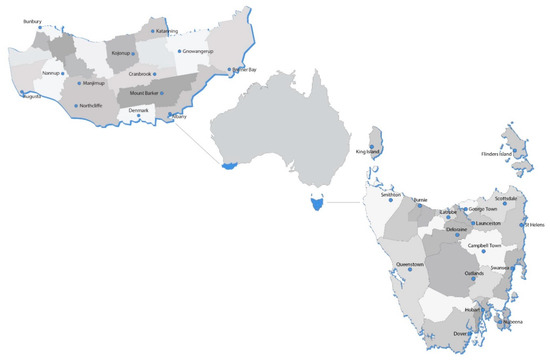 The study was conducted in two Australian regions; the state of TAS and the SWA region, which encompassed the South West and Great Southern regions of WA [29] (Figure 1). Despite being geographically far apart, TAS and SWA have similar fruit and vegetable production when compared to other states and territories (previously described in [25]).