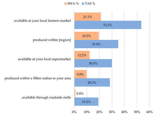 Not only understanding what local food is but being able to identify these foods requires consumers to have a sound understanding of both seasonality and what is grown in their region. In our study, most consumers identified RGFFV through product labels in both TAS and SWA. It has been reported that consumers who often looked at labels to see where a product was grown were more likely to seek local agricultural produce and pay a higher price [40]. In line with research that suggests that the vast majority of consumers want to know where their produce comes from, in Australia it is mandated that all staple foods have “country of origin” labels, which vary according to whether the food was (a) grown, produced or made in Australia, (b) packed in Australia, or (c) imported into Australia. However, more localized provenance labelling of fruits and vegetables is not commonplace in TAS or SWA in the same way specialty products such as wines and cheeses are. This gap, alongside our findings, shows opportunities for producers in these regions to campaign for clearer and more prominent provenance labelling.