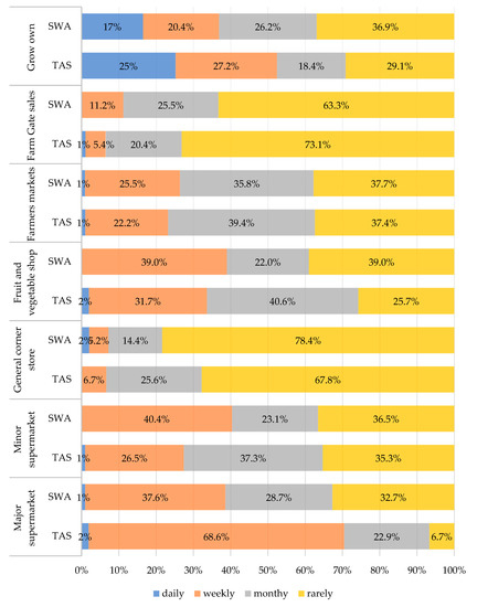 The shopping frequency of respondents in TAS and SWA at each of the shop locations is displayed in Figure 3. Results indicated that TAS respondents shopped more frequently (weekly: 67%) at major supermarkets in comparison to SWA respondents (weekly: 38%), (p < 0.001). More TAS respondents reported shopping monthly at fruit and vegetable shops in comparison to more SWA respondents who reported shopping rarely (p = 0.012). There was no significant difference in shopping frequencies at minor supermarkets, general/corner stores, farmers’ markets, farm gate sales or for those who accessed the fruits and vegetables they grew themselves (all p = 0.05).
