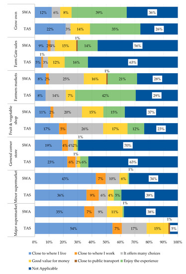 A chi-square test investigated whether shopping frequencies reported by the respondents differed according to their sociodemographic characteristics, including age, education level, and number of adults or dependents in the household. Significant differences were identified in the shopping frequency at general/corner stores by age, where younger respondents shopped more frequently than older adults (p = 0.034). Older adults reported more frequently accessing produce they grew on their own (p = 0.001) in comparison to younger respondents. Respondents with secondary level education shopped more frequently at general/corner stores than those with tertiary education (p = 0.003). Lastly, those households with three or more dependents shopped more frequently at major supermarkets in comparison to those households with fewer (or no) dependents, who predominantly shopped weekly (p = 0.004). There were no other significant differences in shopping frequencies according to sociodemographic characteristics (all p > 0.05). The major motivating reason for shopping at each shop location is displayed in Figure 4. Being close to public transport was not a major motivating factor for shopping at any location, with this reason contributing 1% or less for any shopping outlet. Respondents in both TAS and SWA were most likely to report that a shop being close to where they live as the main motivating factor for shopping there, especially for major supermarkets with 54% and 35% reporting this in TAS and SWA, respectively. In TAS and SWA, respondents reported enjoying the experience of both farmers’ markets and growing their own fruits and vegetables. However, for major supermarkets, more TAS respondents (55%) reported proximity to where they live as the main motivating factor for shopping in major supermarkets as compared to SWA respondents (35%) (p < 0.001). Additionally, more TAS respondents reported enjoying the experience of farmers’ markets (42%) in comparison to SWA respondents (21%) (p = 0.012). There was no significant difference in major motivating factors for shopping at minor supermarkets, general/corner stores, fruit and vegetable shops, farm gates or for those who grew their own (all p ≥ 0.05).
