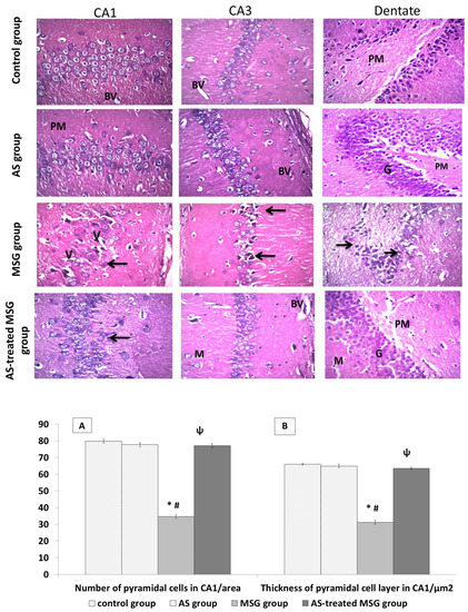 Light microscopic examination of hematoxylin and eosin (H&E)-stained sections in all groups. Control and Allium sativum (AS) groups showed normal histological structure of hippocampus. Monosodium glutamate (MSG) group showed decrease in the number of the cells in Cornu Ammonis° (CA1 and CA3) areas with shrinkage and disarrangement of pyramidal cells. Apoptotic and pyknotic nuclei of pyramidal cells surrounded with pericellular haloes. Dilated blood vessels and massive vacuolation of the cytoplasm (V) can be also seen. Dentate gyrus of the same group showed many apoptotic cells (arrows), darkly stained nuclei, vacuolated cytoplasm (V), and disorganized blood vessels (BV). Allium sativum-treated MSG (AS-treated MSG) group was more or less like the control group, with multiple dilated blood vessels. (Hx. &E. X400). Histograms (A) and (B) indicate significant decrease in pyramidal cell count and layer thickness in the CA1 region in the MSG group compared to the control and AS groups. In addition, the AS-treated MSG group showed a significant increase in these parameters compared to the MSG group. * p < 0.05, vs. control; ψ p < 0.05, vs. MSG.