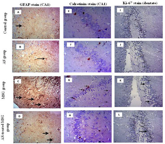 Light microscopic examination of glial fibrillary acidic protein (GFAP)-stained sections of CA1 in the hippocampus (A–D) showing strong positive immune staining in MSG group compared with the control and AS groups. AS-treated MSG group showed weak reaction (arrows) (GFAP X400). Calretinin-stained sections of CA1 in the hippocampus (E–H) showed weak immune positive reactive neurons in control, AS, and AS-treated MSG groups, but MSG group showed strong positive reactive neurons (arrows) (Calretinin X200). Additionally, light microscopic examination of Ki-67-stained sections of the dentate of hippocampus (I–L) showed marked positive immune stain in the sub-granular zone (arrows) in the control and AS groups. The number of Ki-67 immunoreactive nuclei was significantly decreased in the MSG group compared to the control group. AS-treated MSG group was more or less like the control group (Ki-67 X400). * p < 0.05, vs. control; ψ p < 0.05, vs. MSG.