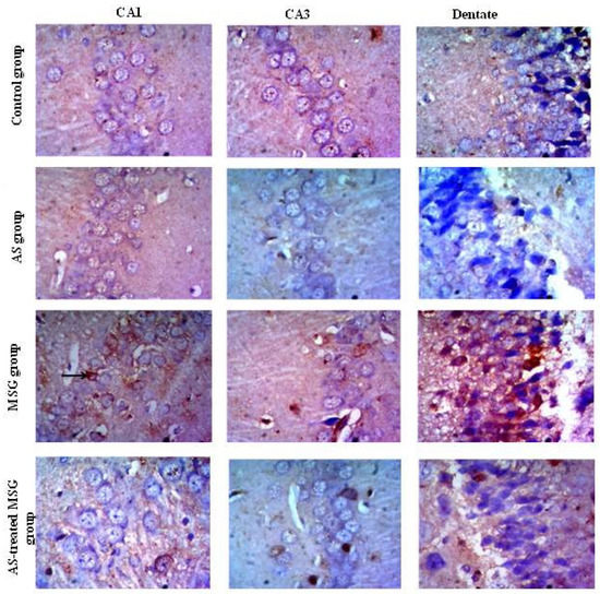 Light microscopic examination of caspase-3 stained sections of CA1, CA3, and dentate gyrus of the hippocampus. The figure shows weak cytoplasmic immune staining reaction in all areas in control and AS groups. The MSG group showed strong positive cytoplasmic immune staining reaction (arrows) in all areas, whereas the AS-treated MSG group showed moderate reaction (caspase-3 X400).