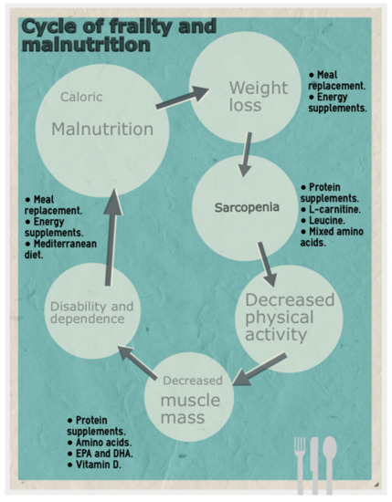 The phenotype proposed by Fried [5] (Figure 1) frames sarcopenia secondary to malnutrition as contributing to low physical activity and increased dependence. Both entities, obesity and undernutrition, are related to sarcopenia and frailty although these conditions are more prevalent in residential and hospital settings than in the community [13,14]. Both the quantitative assessment (energy intake) and the qualitative assessment (nutrient quality) are important because the lack of micronutrients (Vitamin D or leucine) and macronutrients (proteins) are considered risk factors for frailty, while the type of diet (Mediterranean diet) can prevent or reverse frailty [15]. In addition, nutritional screening using the Mini Nutritional Assessment (MNA) or Short Form MNA (MNA-SF) is recommended for the detection of malnutrition [16,17]. On the other hand, some studies report that undernutrition is not the only nutritional state related to frailty; some parameters for overnutrition, such as elevated BMI, high body fat percentage and central obesity in adulthood could also increase risk in aging [18,19].