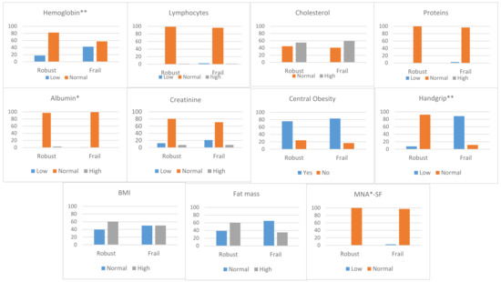 For the nutritional assessment, we compared participants based on BMI (Figure 2). Lymphocyte and protein values were mostly in the normal range. The percentage of participants with anemia was higher in the prefrail/frail group (13.73% vs. 42.62% p < 0.001). Albumin values were normal in most of the sample. In both groups, there was a high percentage with hypercholesterolemia (robust 55.1% vs. frail 59.2%), central obesity (robust 75.8% vs. frail 83.3%) and obesity (robust 60.4% vs. frail 50.1%). However, the percentage of participants with high body fat was lower in the prefrail/frail group (60.4% vs. 35%), and the percentage with low palm grip strength was higher (7.7% vs. 88.6%). Nutritional status, as assessed by the MNA-SF, was adequate in 2.7% of the frail elderly.
