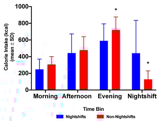 Energy intake (kcal) in each time bin between nightshifts (blue) and non-nightshifts (red) n = 20). Morning = 07:00–12:00 h; Afternoon = 12:00–17:00 h; Evening = 17:00–21:00 h; Nightshift = 21:00–07:00 h. * p < 0.05 for energy intake between 17:00–21:00 h and 21:00–07:00 h on non-nightshifts compared to the corresponding nightshift.