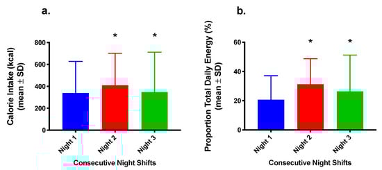 (a) Energy intake (kcal) and (b) proportion (as percentage) of total daily energy consumed during the nightshift phase (21:00–07:00 h) in nurses working three consecutive nightshifts (n = 12). * p < 0.05 for energy intake and proportion of total daily energy compared to Night 1 (two-way ANOVA).