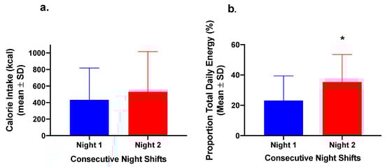 (a) Energy intake (kilocalories) and (b) proportion (as percentage) of total daily energy intake consumed during the nightshift phase (21:00–07:00 h) in nurses working two consecutive nightshifts only (n = 8). * p < 0.05 for the proportion of total daily energy compared to Night 1 (paired t-test).