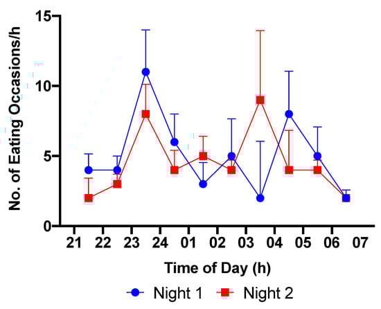 Examination of the number and distribution of eating occasions across the nightshifts showed there to be no significant difference in the number of eating occasions during the nightshift between Nights 1 and 2. The distribution of eating occasions across Nights 1 and 2 is shown in Figure 5. On both nights there was a peak in the number of eating occasions between 23:00 and 24:00 h. A second peak was observed between 04:00 and 05:00, and 03:00 and 04:00 h on Nights 1 and 2, respectively.