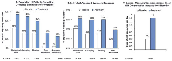 To assess the efficacy and meaningfulness of treatment, three broad groups of LI patient experiences were evaluated—a LI composite score to measure specific symptoms, milk and dairy intake to evaluate patients’ ability to increase dietary lactose with treatment, and global assessment measures to assess patients’ overall satisfaction with therapy. This three-pronged assessment provided a comprehensive evaluation of how treatment influenced symptoms of LI and the day to day lives of patients.