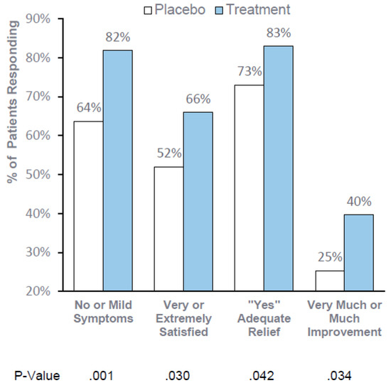 “Real-world” Observation Period—Global Patient Assessments 30 days Post-Treatment: Significantly more treated patients (82%) reported “no symptoms” or “mild symptoms”, respectively) as compared to 64% in the placebo group after treatment (p = 0.001, Efficacy Subset mITT). In addition, significantly more treated patients reported satisfaction with the ability of RP-G28 to prevent or treat their LI symptoms, with 66% of treatment patients reporting “very satisfied” or “extremely satisfied” as compared to 52% in the placebo group (p = 0.030, Efficacy Subset mITT). Patients’ perception of adequate relief from LI symptoms and patients’ global impression of change were also improved with treatment (p = 0.042 and P = 0.034 respectively, Efficacy Subset mITT) (Figure 3).