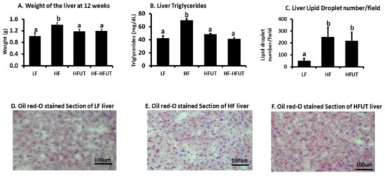 Supplementation with UT vegetable lowers liver weight and liver triglycerides but not liver lipid droplet number. (A) The weight of the liver was higher in HF compared to LF fed group (p < 0.05; n = 9). Supplementation of the HF diet with UT vegetable from beginning of the study or after 6 weeks of HF feeding lowered liver weight to levels similar to that of the low fat (LF) (p < 0.05; n = 8–9). (B) Liver triglycerides were higher in HF compared to LF fed group (p < 0.05; n = 9). Supplementation of the HF diet with UT vegetable from beginning of the study or after 6 weeks of HF feeding lowered liver triglycerides to levels similar to those of the LF group (p < 0.05; n = 8–9). (C–F) Oil red O (ORO) stained liver slides from HF fed mice showed highly increased lipid droplets compared to the LF group. The lipid droplet number in the HFUT group was not different from that of the HF group. a,b Different letters indicate a significant difference among treatments at p < 0.05.