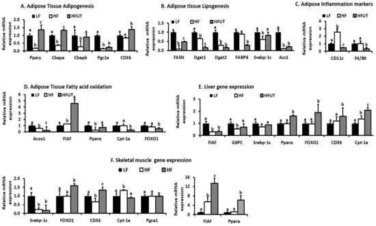 Primer sets (IDT Technologies, Coralville IA, USA) were used for analyses of selected genes. The genes selected for this analysis were not exhaustive but we selected genes that have been shown to impact adipogenesis, lipogenesis, fatty acid oxidation, and gluconeogenesis. RT-PCR cycling conditions on the CFX 96 (Bio-rad, Hercules CA, USA), were 2 min at 50 °C and 2 min at 95 °C, followed by 40 cycles of two-step PCR denaturation at 95 °C for 15 s and annealing extension at 60 °C for 1 min. Duplicate assay samples contained 10 ng cDNA and 6 μmol/L primers in 2× PowerUp™ SYBR™ Green Master Mix (Thermofisher Scientific, RockVille, MD, USA) in a final volume of 20 μL. Means of duplicates were taken, and relative amount of target mRNA was normalized to β-actin levels as an endogenous control gene. Data were analyzed according to the 2−ΔΔCT method, and fold difference was calculated between LF, HF, and HFUT groups. A list of primers used is shown in Supplementary Table S1.