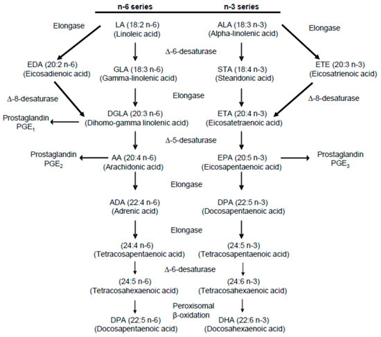 Summary of the metabolic pathway for n-6 and n-3 polyunsaturated fatty acids [15].