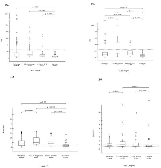 Serum levels of antibodies to Saccharomyces cerevisiae (ASCA) in IgA (a) and IgG (b) classes, Pseudomonas fluorescens-associated sequence (anti-I2) (c) and Bacteroides caccae TonB-linked outer membrane protein (anti-OmpW) (d) in autoantibody-negative relatives. Horizontal lines indicate the cutoff level for seropositivity of each antibody.