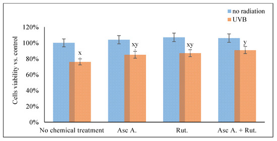 The viability of the 3D cultured fibroblasts exposed to UVB irradiation (200 mJ/cm2) and treated with ascorbic acid [100 µM] and/or rutin [25 µM]. Abbreviations: Asc, ascorbic acid; Rut, rutin; Ctr, control. Mean values ± SD of three independent experiments are presented. x, statistically significant differences vs. non-irradiated group without chemical treatment, p < 0.05; y, statistically significant differences vs. non-irradiated group, p < 0.05.