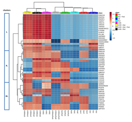 The ascorbic acid and rutin induced changes in the protein expression of UV-irradiated fibroblasts were hierarchically clustered, as is shown for the top 50 proteins (Figure 2). Therefore, it was possible to distinguish 3 larger clusters containing: