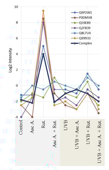 The intensity of the proteins creating complex with active heat shock protein 90 (HSP90) in 3D cultured fibroblasts treated with rutin [25 µM] and/or ascorbic acid [100 µM], and exposed to UVB irradiation (200 mJ/cm2). Abbreviations: Asc A, ascorbic acid; Rut, rutin. Proteins: P0DMV8—heat shock protein 70 (HSP70); Q2F839—heat shock protein 90 (HSP90); Q59E89—heat shock protein 40 (HSP40); Q8L7U4—co-chaperone protein p23; Q99933—BAG family molecular chaperone regulator 1; Q9P2W1—homologous-pairing protein 2 (HOP2). Analysis made using ComplexBrowser.