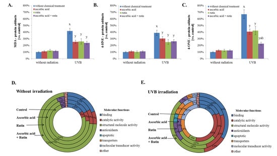 The level of protein adducts with selected lipid peroxidation products, such as malondialdehyde (MDA) (A), 4-hydroxynonenal (4-HNE) (B), and 4-oxynonenal (4-ONE) (C); the molecular functions of these proteins in 3D cultured fibroblasts were treated with rutin [25 µM] and/or ascorbic acid [100 µM] (D), and exposed to UVB irradiation (200 mJ/cm2) (E). Analysis made based on data from the Panther Classification System. Mean values ± SD of three independent experiments are presented. x statistically significant differences vs. non-treated group, p < 0.05; y statistically significant differences vs. group without chemical treatment, p < 0.05; a statistically significant differences vs. ascorbic acid treated group, p < 0.05; b statistically significant differences vs. rutin treated group, p < 0.05.