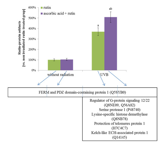 The level of rutin-protein adducts and the names of these proteins in 3D cultured fibroblasts treated with rutin [25 µM] and/or ascorbic acid [100 µM], and exposed to UVB irradiation (200 mJ/cm2). Analyses were made based on label free quantification. Mean values ± SD of three independent experiments are presented. a statistically significant differences vs. non-irradiated group, p < 0.05; b statistically significant differences vs. rutin treated group exposed to the UVB irradiation, p < 0.05.