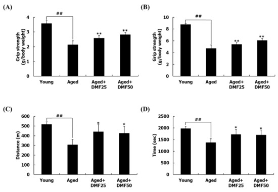 Effect of DMF on muscle function. (A) Forelimb strengths, (B) fore/hindlimb strengths. Grip strengths were normalized to the body weight. (C) Running distance, (D) running time. Results are presented as the mean ± SD; ## p < 0.01 vs. Young group; * p < 0.05, ** p < 0.01 vs. Aged group.