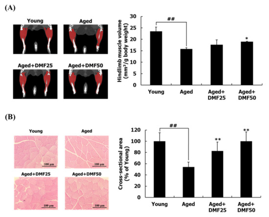 Effect of DMF on body composition. (A) Hindlimb volume. (B) The cross-sectional area of the gastrocnemius muscle fiber (magnification, ×200). Muscle volume was normalized to the body weight. Results are presented as mean ± SD; ## p < 0.01 vs. Young group; * p < 0.05, ** p < 0.01 vs. Aged group.