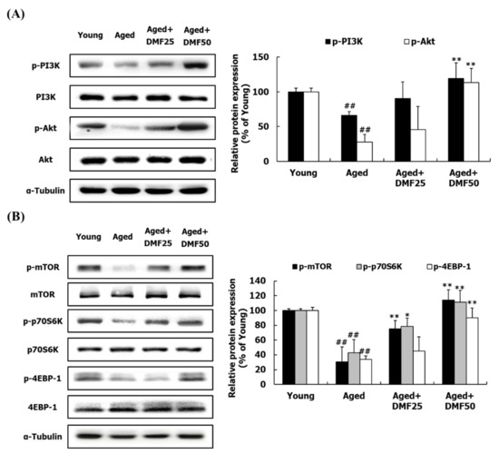 Effects of DMF on PI3K-Akt and mTOR pathways in the gastrocnemius muscle. (A) Relative phosphorylation of PI3K and Akt. (B) Relative phosphorylation of mTOR, p70S6K, and 4EBP1. Results are presented as mean ± SD; ## p < 0.01 vs. Young group; * p < 0.05, ** p < 0.01 vs. Aged group.