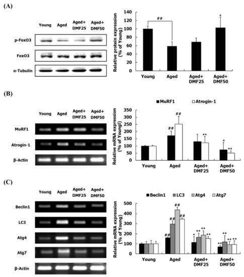 Effect of DMF on FoxO pathway in the gastrocnemius muscle. (A) Relative phosphorylation of FoxO. (B) Relative mRNA levels of MuRF1 and atrogin-1. (C) Relative mRNA levels of beclin1, LC3, Atg4, and Atg7. Results are presented as mean ± SD; ## p < 0.01 vs. Young group; * p < 0.05, ** p < 0.01 vs. Aged group.
