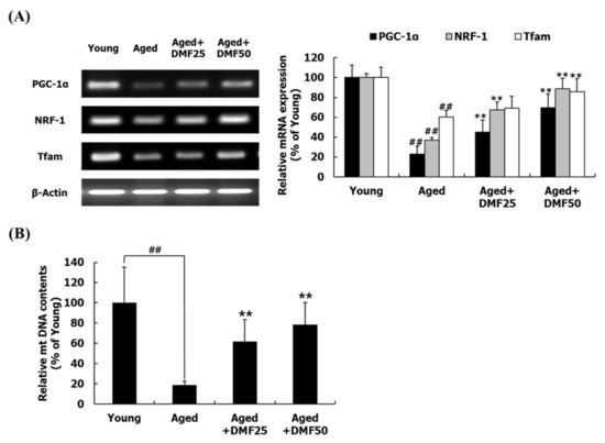 Effect of DMF on mitochondrial biogenesis in the soleus muscle. (A) Relative mRNA levels of PGC-1α, NRF-1, and Tfam. (B) Relative mtDNA contents. Results are presented as mean ± SD; ## p < 0.01 vs. Young group; ** p < 0.01 vs. Aged group.