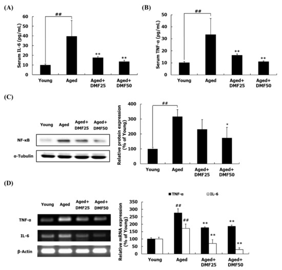 Effects of DMF on inflammatory responses in serum and the gastrocnemius muscle. (A) Serum IL-6 level. (B) Serum TNF-α level. (C) Relative protein level of NF-κB. (D) Relative mRNA levels of IL-6 and TNF-α. Results are presented as mean ± SD; ## p < 0.01 vs. Young group; * p < 0.05, ** p < 0.01 vs. Aged group.