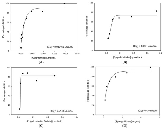 IC50 plots of AChE inhibition: concentration against percentage inhibition for each of the active compounds tested. (A) galantamine, (B) epigallocatechin, (C) epigallocatechin-3-gallate and (D) synergy mixture.